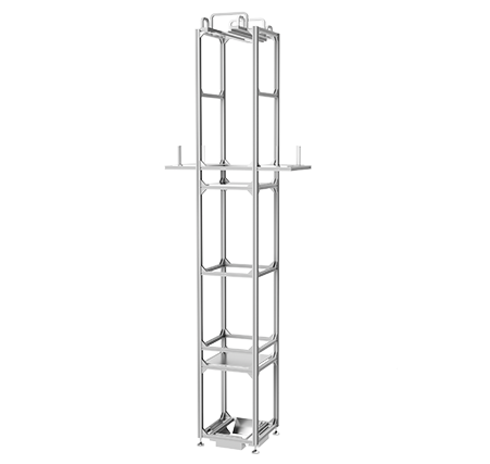 The tower elevator facilitates the placement or lowering of the overhead traveling crane into the track for maintenance using the internal chain. It features a closed design for seamless connection between the OHT track and the ground tooling trolley.